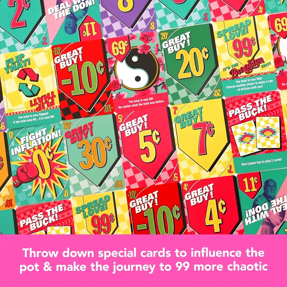 Dive into a refreshing whirlwind of fun with Great 99: The Game, featuring the ever-popular AriZona Iced Tea! This quick and exciting family card game invites players to flip, strategize, and collect as you race to hit the magical total of 99 cents without going over. Play your “Add Your Cents” cards to raise the pot and cleverly throw down special cards that can influence the outcomes and keep your opponents on their toes. Yep, it’s a casual game of high stakes, laughter, and a bit of friendly rivalry!