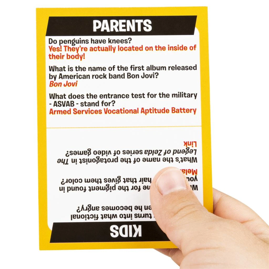 Beat the Parents is the family showdown game where kids compete against their parents for household supremacy! There are more than just bragging rights at stake – each team must pick a wager before the game can begin. What are you willing to do if you lose? Wash the dishes? Treat the other side to movie night? Use the dry erase marker and wager board to put the stakes on display, and then start the competition! Each team reads trivia questions about their generation to the other side, moving their pawn on the board with every successful answer. Reach a Challenge space, and compete team vs team in crazy, up-and-active challenge. Make it to the end of the board first and complete one final challenge to be crowned the winners – and enjoy the wager you’ve just won! This family game night, the stakes have never been higher – or more fun!