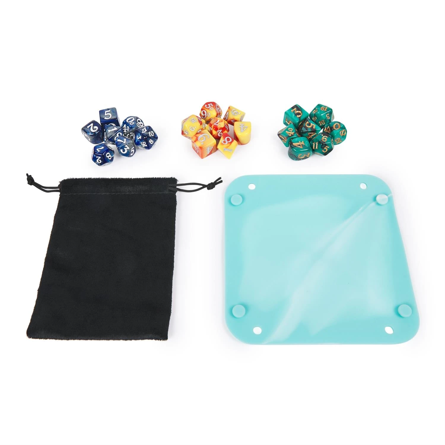 Campaign Dice from Spin Master Games provides you with 21 high-quality dice for your role-playing and board games. The 3 sets of 7 dice each feature swirled green and black, yellow and red, and blue and silver coloring with easy-to-read white lettering. Matching white and teal swirled silcone dice tray helps control rolling with raised sides that fold down flat for storage. The dice come in standard cubes and polyhedral forms, which were made specifically for role-playing games. Also includes one storage pouch. Whether you play Dungeons and Dragons, Magic the Gathering, or other RPG tabletop board games, look no further for your dice. These 3 sets of dice are for players ages 8 and up. With this convenient dice bag, you can take your Campaign Dice to game night with your friends or to school to play with your classmates. This is the perfect Dungeons and Dragons gift for any D&D gamer or book-lover. If you need DND dice for your role-playing dice games, along with your DND miniatures and books, this set of Campaign Dice will look great on your game table. Your favorite tabletop dragon game is simply not complete without this gorgeous set of 21 polyhedral dice from Spin Master Games. Get Campaign Dice today to take your game to the next level