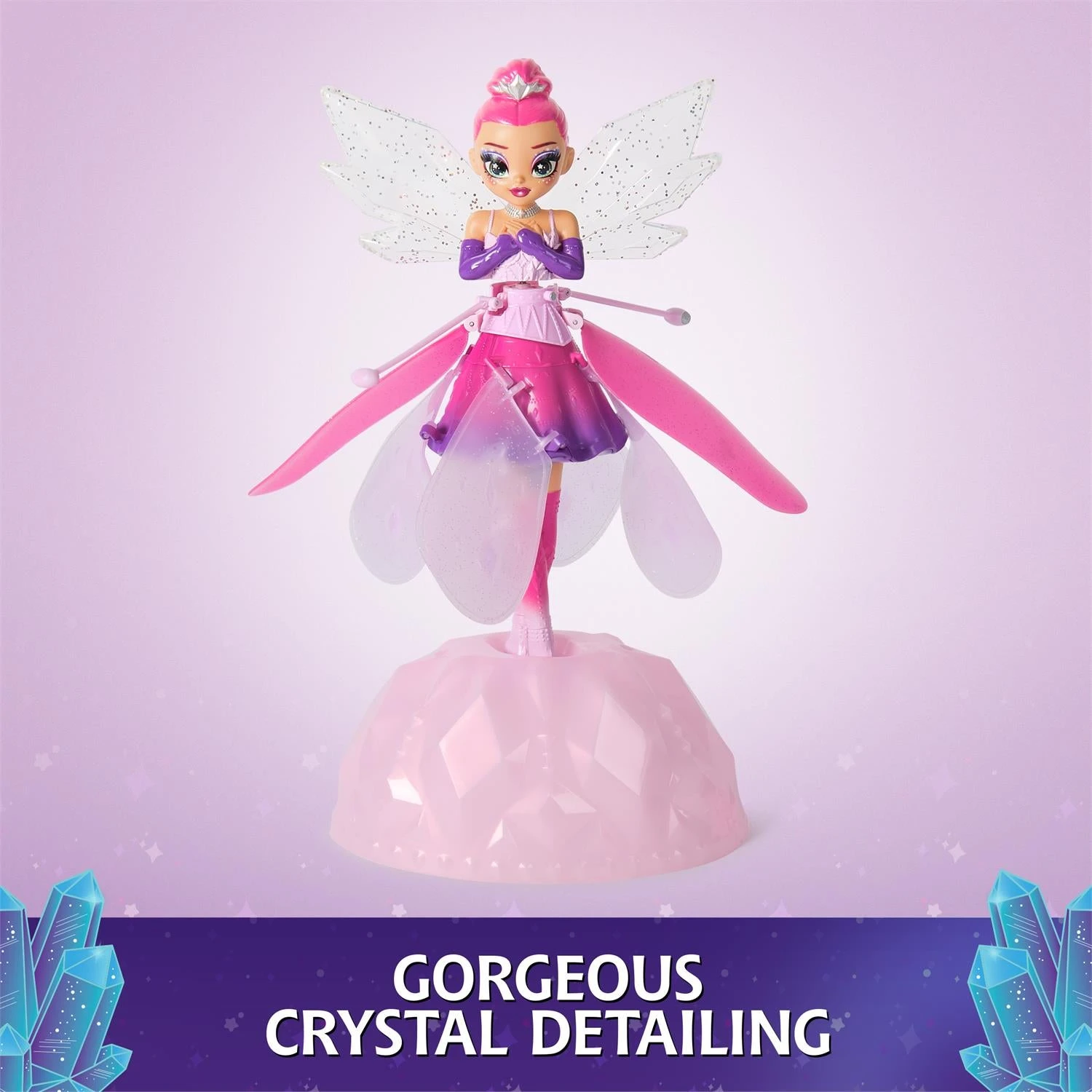 Bring magic to life with the enchanting Crystal Flyers, the flying fairy doll that responds to your touch! With extraordinary visual appeal and interactive play, this toy allows your child to launch the fairy from the crystal platform or directly lift her into the air. As your hands guide her, sensors detect their movement, creating the illusion of magical flight. Crystal Flyers boast stunning crystal wings and a trendy pink dress adorned with metallic accessories, making them a beautiful addition to any toy collection. When not in flight, she stands elegantly on her crystal platform, ready to dazzle with her sparkly design.