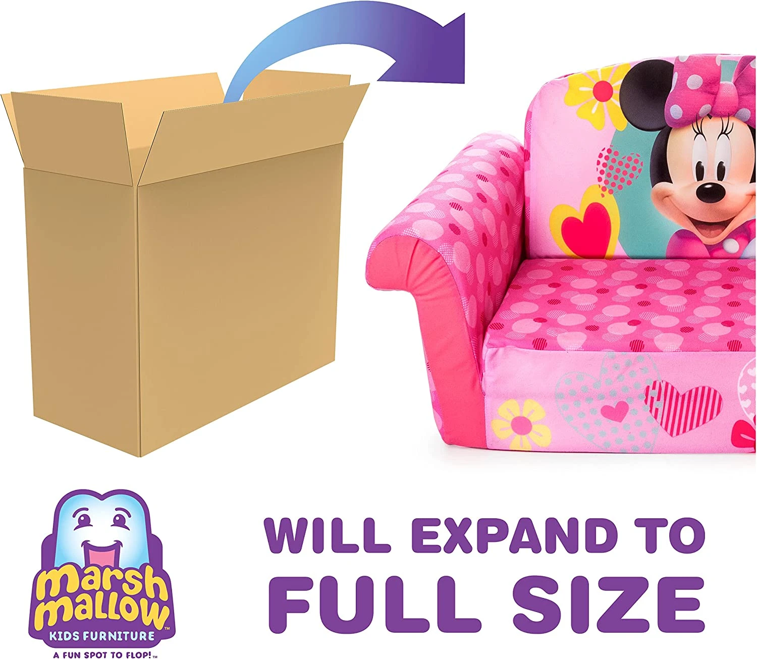 Transform your little one’s space into a magical haven with the Marshmallow Furniture Toddler 2-in-1 Flip Open Foam Compressed Sofa featuring Minnie Mouse. This delightful piece, bursting with pink shades and fun patterns, is perfect for lounging or nap time. It effortlessly converts from a cozy sofa to a comfortable lounger, making it versatile and practical for any playroom.