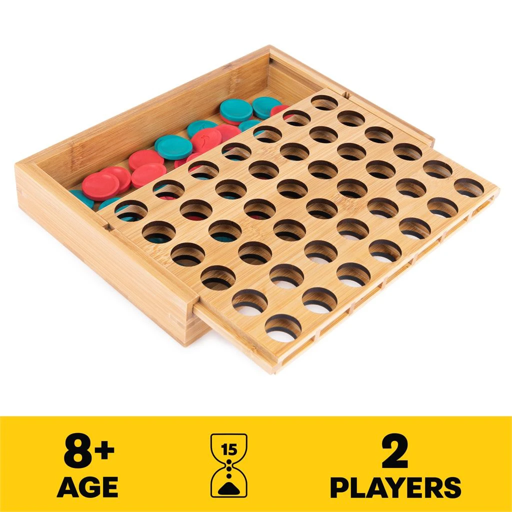 - TOP KNOTCH DESIGN: You will love the beautiful blue and red pieces and smooth wooden bamboo board. Be the first to get 4 chips in a row, horizontally, diagonally, or vertically, but always in a straight line.
