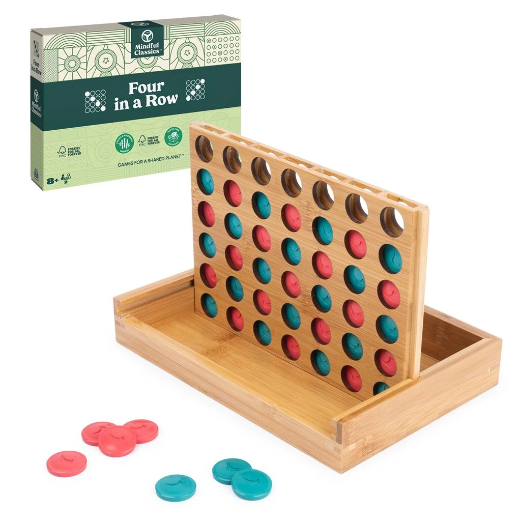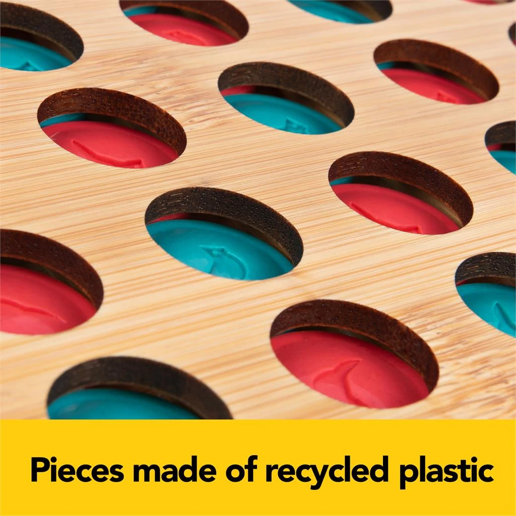 - ECO-FRIENDLY GIFT: This Four in a Row game has pieces made from recycled plastic, and the packaging is plastic-free. The game board is made from FSC certified bamboo- a 100% FSC certified item.